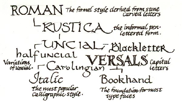 As you can see from the chart above, our current alphabet is essentually Roman. For the calligrapher, the most interesting periods in history are from the Roman period through the Renaissance (100-1600 A.D.). It was during this time, that the pen-lettered alphabets that we study and use today were developed. The major alphabets from that time span (in chronological order) are: Roman, uncial, blackletter, italic, and bookhand. Each of these 5 has numerous variations, and it is from these 5 alphabets that most of the modern type-faces or fonts are derived.
